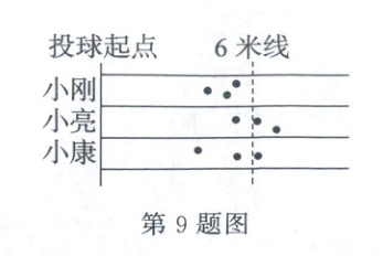 9. 三名同学练习投实心球,每人投$3$次,如图记录了他们三人投球的情况。其中一名同学$3次投球的平均成绩最接近6$米,这名同学是(