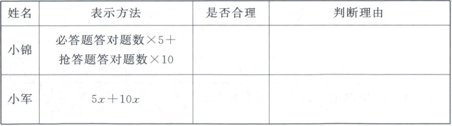 1. 两名同学分别写了一个表示选手得分的式子,请你做一个简单的评价。(如果不合理,请在最后一列写出你的判断理由)