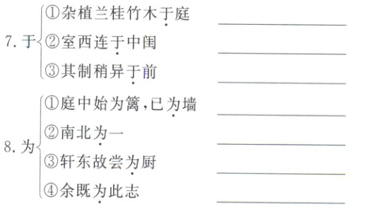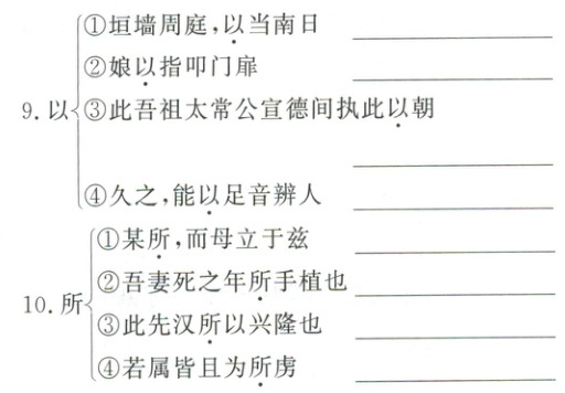 1.①女子出嫁 ②归还 ③归依 ④返回 ⑤汇聚 2.①获得 ②能够 3.①安置 ②设置 ③放弃,丢下 4.①每次 ②经常,不止一次 5.①副词,应当 ②对着 6.①助词,用在主谓之间,取消句子独立性,不译 ②助词,补足音节,不译 ③代词,她 ④助词,的 7.①介词,在 ②介词,和 ③介词,和,跟 8.①砌 ②成为 ③是 ④写 9.①介词,用 ②介词,用 ③连词,相当于“而”,表修饰 ④介词,凭借 10.①地方、处所 ②助词,用在动词前,构成名词性词组,指代人或事物 ③“所”与“以”连用,表原因,“……的原因” ④助词,与“为”连用,表被动