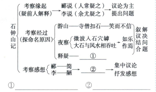5.作者以“质疑—释疑—得出结论”三个步骤展开全文。本文一开始就提出郦道元和李渤的说法,并提出对这两种说法的怀疑。第二段写作者的探察过程,提到寺僧使小童持斧扣石,作者对此种验证方法“固笑而不信”,回应前文李渤的说法。而作者所见的两处声源——石穴罅和空中而多窍的大石,则回应了郦道元的说法。待实地考察得出真相之后,在第三段中,作者又回扣前文,“叹郦元之简”“笑李渤之陋”。 6.苏轼实地考察后发现“大声发于水上,噌吰如钟鼓不绝”“与风水相吞吐,有窾坎镗鞳之声”。并且两者相应,“如乐作焉”,这说明了水声如钟,所以,石钟山应是以声得名。这与古人郦道元的说法“微风鼓浪,水石相搏,声如洪钟”相合,所以说,“古之人不余欺也”。 7.①作者在写发现石钟山命名的原因之前,先写大石、栖鹘、鹳鹤等,运用了比喻的修辞手法,进行形状、摹声和绘态,渲染了可怖的气氛。②采用由上(视觉)到下(听觉)的观察角度,着重描写石钟山月夜的阴森恐怖,说明一般人在平常情况下不敢涉足。