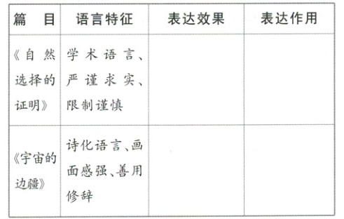 5. 诵读你所找出的句子,思考归纳它们的语言特征、表达效果和表达作用,并完善下表。