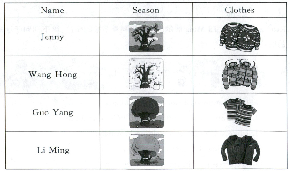 九、Read,choose and write. 同学们分享了各自喜欢的季节以及穿搭。根据表格内容,选择合适的单词,将短文补充完整。(10分)