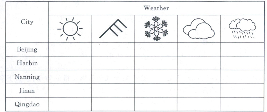 四、Listen and tick. Jenny的爸爸要去外地出差,他正在收听全国的天气预报。听录音,在表格的相应位置打“√”。(10分)