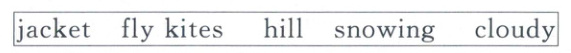 1. hill 2. fly kites 3. cloudy 4. snowing 5. jacket