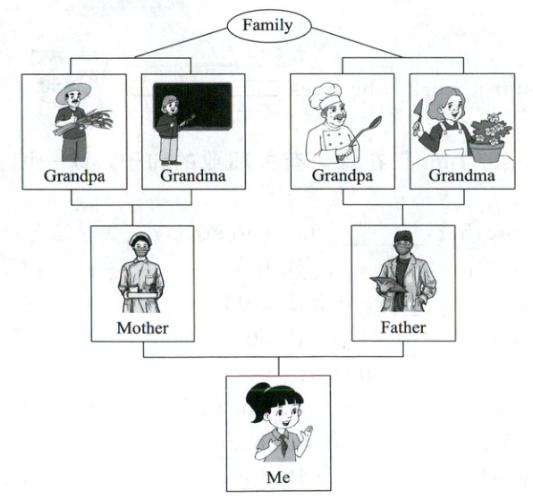 . This is my grandma, my mother's mother. She is a teacher. Look, he is my father's father—my grandpa. He is a 2. E