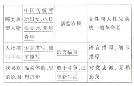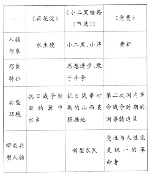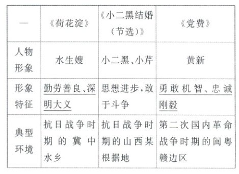 1. 《荷花淀》《小二黑结婚(节选)》《党费》都是作家深入群众、深入生活后的创作成果,都塑造了令人印象深刻的典型形象。请分析作品中人物的形象特征,并结合作品的时代背景和小说中的社会环境,分析人物的典型性,完成下面的表格。