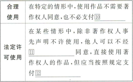 (1)表现 |合理使用|在特定的情形中,使用作品不需要著作权人同意,也不必支付使用费| |法定许可使用|在某些情形中,除非著作权人事先声明不许使用,他人可以不经著作权人同意,直接使用著作权人的作品,但应当按照规定支付使用费|
