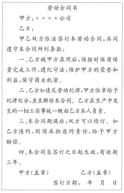 (2)不会签。理由:①合同内容不全面。必备条款是任何劳动合同必须具备的条款,此合同缺少工作内容和工作地点、社会保险、劳动报酬等必备条款。②此合同样本属于无效合同。按照劳动法规规定,合同中应包含双方当事人的权利和义务,但是这份合同只规定了劳动者的义务,排除了劳动者相应的权利;合同中规定的劳动者在生产中发生的一切工伤事故一概由劳动者本人负责,免除了公司的法定责任。③该合同内容违反了劳动合同订立的原则。签订合同应遵循合法、公平等原则。公司拟定的合同权利与义务明显不对等,违背公平原则;“一切工伤事故一概由乙方本人负责”等内容不符合相关法律规定,合同内容不合法。