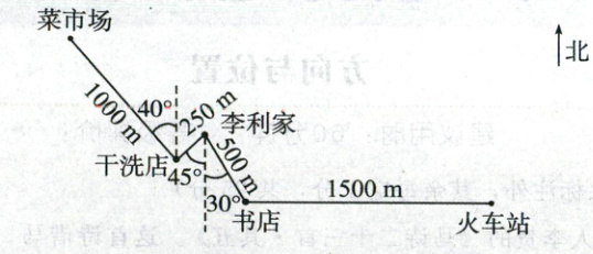 (1)从李利家出发,先向南偏西45°方向走250米到干洗店,再向北偏西40°方向走1000米到菜市场。