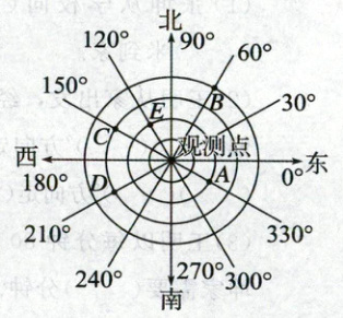 2. 如图,A、B、C、D、E是出现在雷达上的目标。(每相邻两个圆之间的距离是1千米)