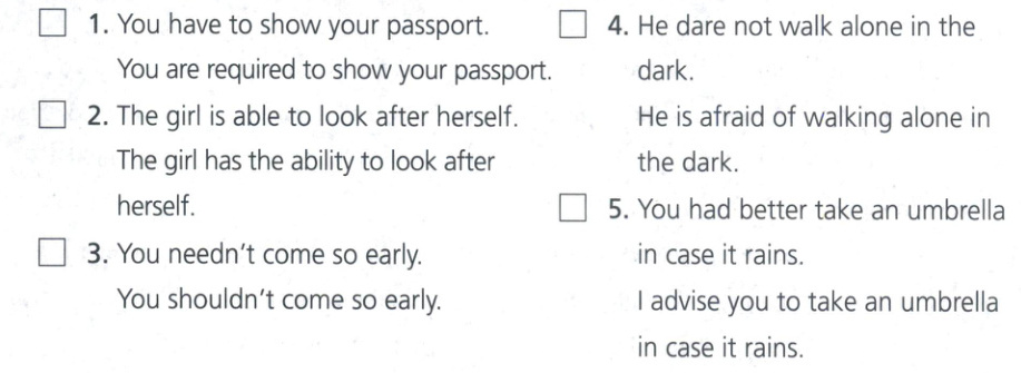 1. You have to return the book in three days. 2. He dared not touch it as it looked frightening. 3. After years of practising, she is able to communicate with French people fluently now. 4. She advised / said that I'd better not stay up too late. 5. You needn't rush as there are still two hours left. 6. You didn't have to buy me this present. 7. The baby girl is only one year old, but she is able to walk on her own now. 8. Dare she try this kind of food? 9. I had better do exercise every day to keep fit. 10. The problem needs to be solved immediately.