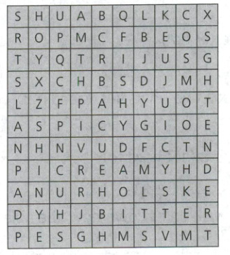 1. BITTER 2. FISHY 3. CREAMY 4. SPICY 5. SMOOTH 6. JUICY 7. TENDER 8. SHINY