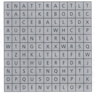 1. ATTRACT 2. LANTERN 3. GUY 4. EXTEND 5. DESSERT 6. SCARF 7. RED ENVELOPE 8. RICE BALLS