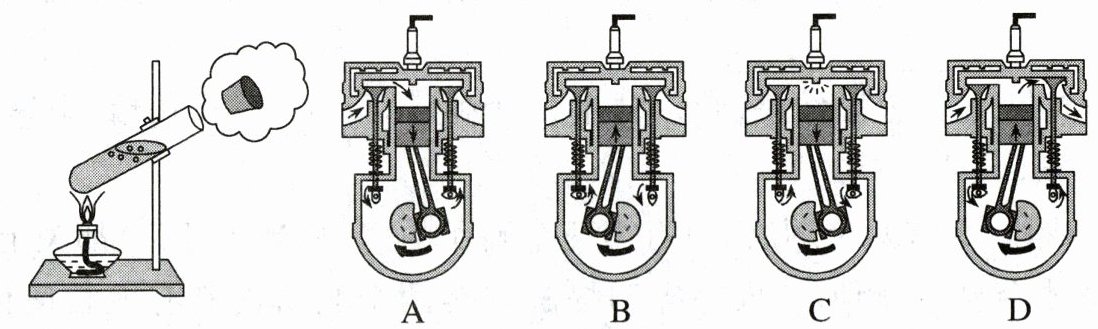 4.(2分)如图所示,在试管内装些水,用橡胶塞塞住管口,对水加热。一段时间后,塞子受到水蒸气的压力会冲出去,这个过程与选项所示汽油机的四个冲程原理相同的是(