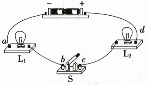 2. 如图所示,开关S闭合时,小灯泡$L_1、$$L_2$都不亮,用一段导线的两端接触a、b两点时,两小灯泡都不亮;接触b、c两点时,两小灯泡也不亮;接触c、d两点时,两小灯泡都亮。对此,下列判断中可能正确的是(