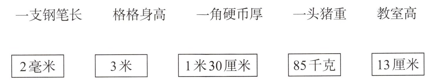 7.一支钢笔长、格格身高、一角硬币厚、一头猪重、教室高