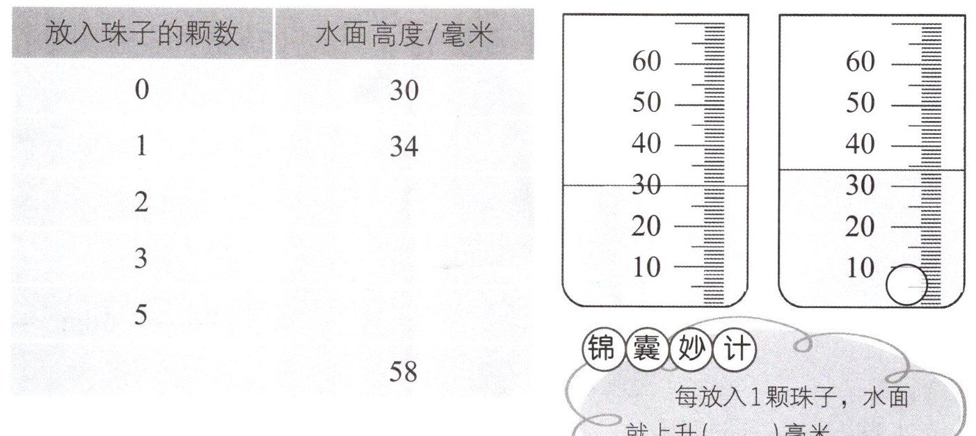 解析:放入1颗珠子,水面升高34−30=4(毫米),放入2颗珠子,水面升高4×2=8 (毫米),此时水面对应的刻度为30+8=38(毫米)。水面高度为58毫米时,比原水面升高了28毫米,28÷4=7(个)。