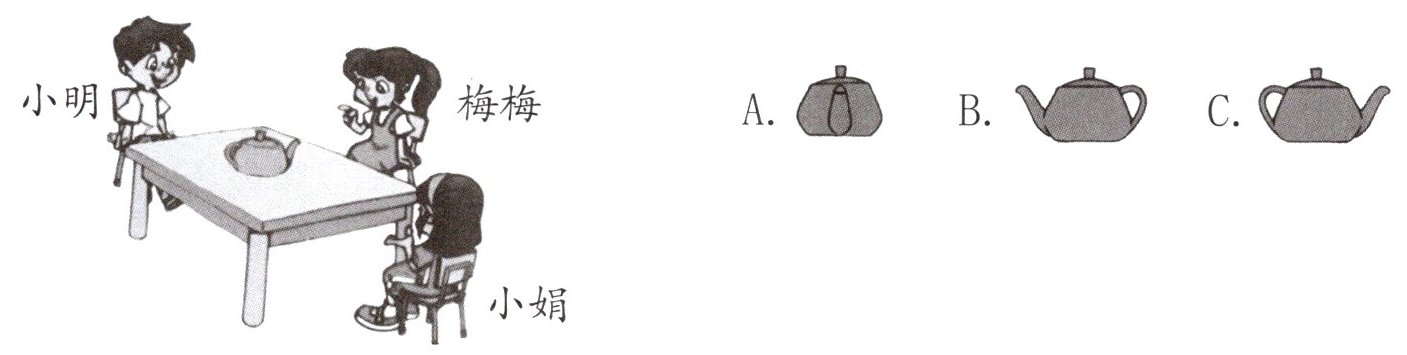 2. 小朋友从不同角度观察茶壶,小明看到的是()。