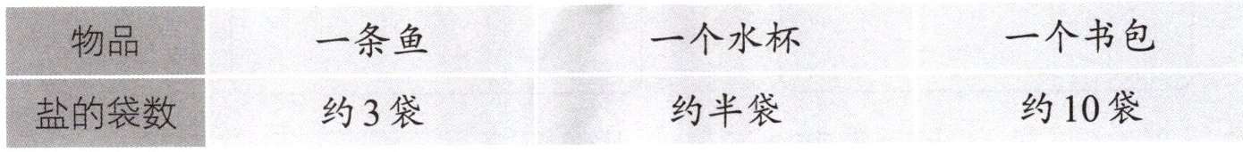 9. 用一些每袋200g的盐称量其他物品,小组同学有这样的记录。根据记录,请你估计这些物品的质量。