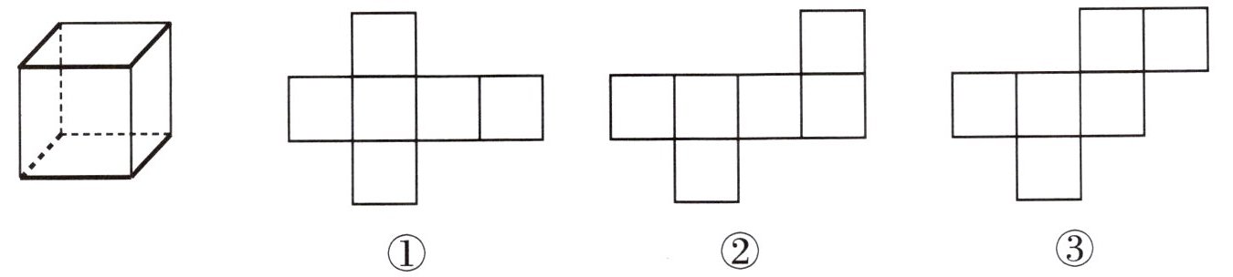1. 把正方体盒子剪开,平铺在桌面上。如果标粗的线要剪开,还要剪开哪些线?请你在图上标注“×”。展开后的形状是右边的()。