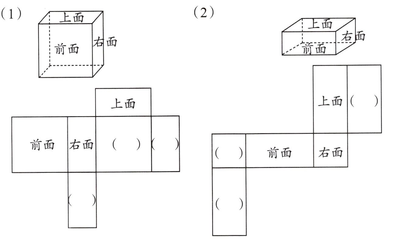 2. 长方体盒子剪开后,平铺在桌面上,请你标出每个面在原来盒子上的位置。