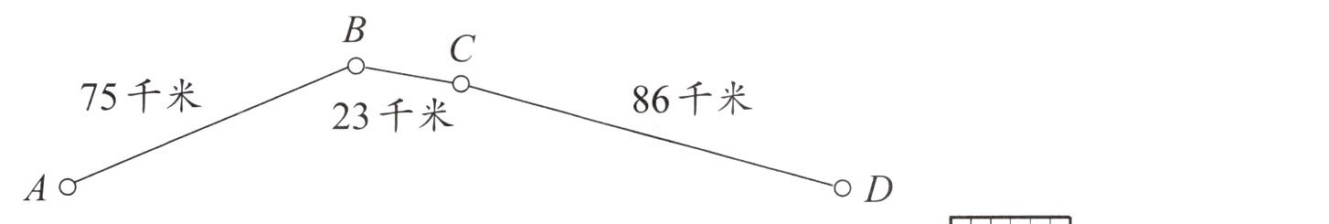 7. 李叔叔骑摩托车从 A 镇去 D 镇旅行,途中要经过 B,C 两个小镇。李叔叔每小时骑行 25 千米,8 小时能到达目的地吗?