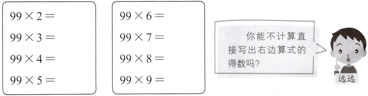 $\begin{aligned}99×2&=\\99×3&=\\99×4&=\\99×5&=\end{aligned}$