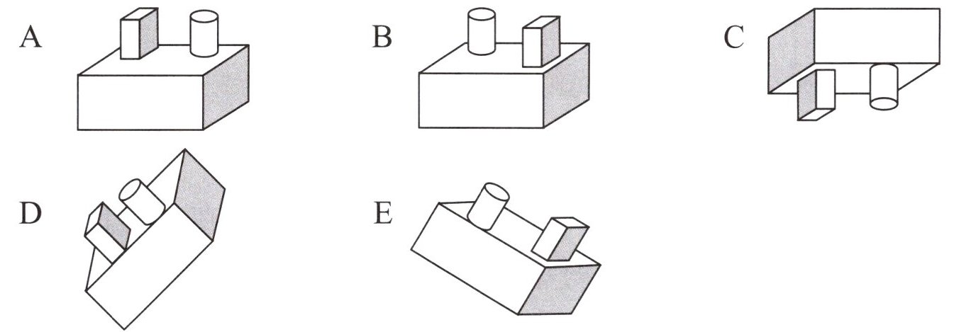 5. 下图都是由两个长方体和一个圆柱组成的,相同的图是()和()。
