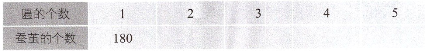 7. 小芸家养了 5 匾蚕,平均每匾能收 180 个蚕茧。你能把下表填完整吗?