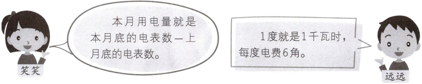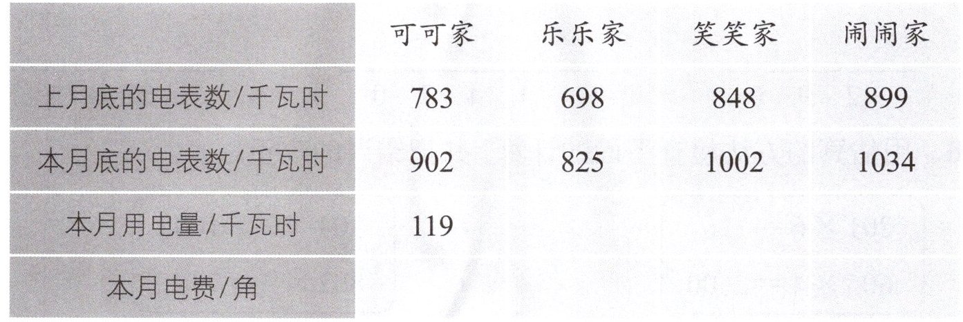 10. 下面是四个同学家上月底的电表数和本月底的电表数,请计算各家本月的电费。