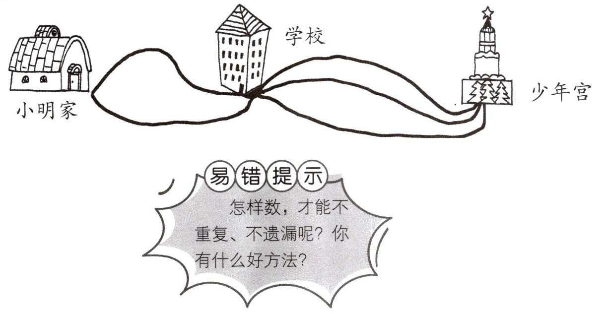 8. 如下图,从小明家出发,经过学校到少年宫,一共有()种不同的走法。