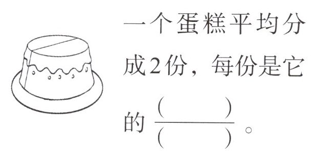 一个蛋糕平均分成2份,每份是它的$\frac{(\space)}{(\space)}$。