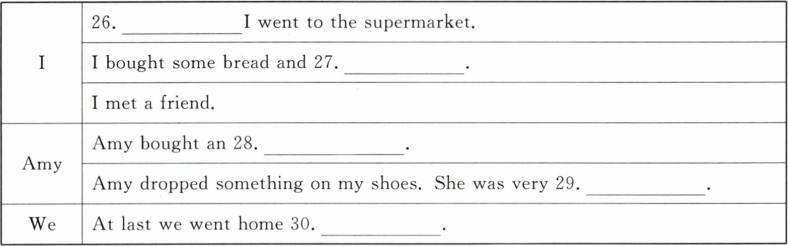 26. Yesterday 27. apples 28. ice cream 29. sorry 30. by bus