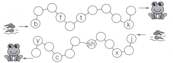 一、(创新题)按顺序把声母补全,帮小蝌蚪找到青蛙妈妈。(14 分)