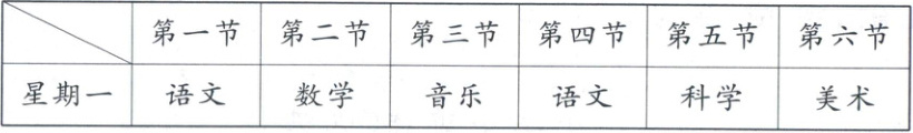 1. 从课程表中,用“○”圈出拼音为“qshù”的生字。(6 分)