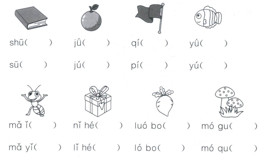shū(√) jú(√) qí(√) yú(√) mǎ yǐ(√) lǐ hé(√) luó bo(√) mó gu(√)
