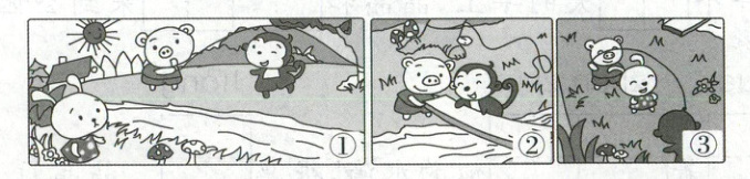 示例:一天,小兔看见小猪和小猴在河对岸跳绳,也想过去玩,但是没有桥,小兔过不去。小猪和小猴灵机一动,找来一块长木板搭成桥。小兔过了桥,和小猪、小猴一起跳绳。它们玩得真开心!