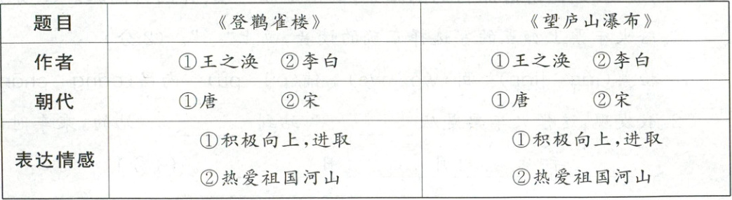 《望庐山瀑布》:②李白 ①唐 ②热爱祖国河山