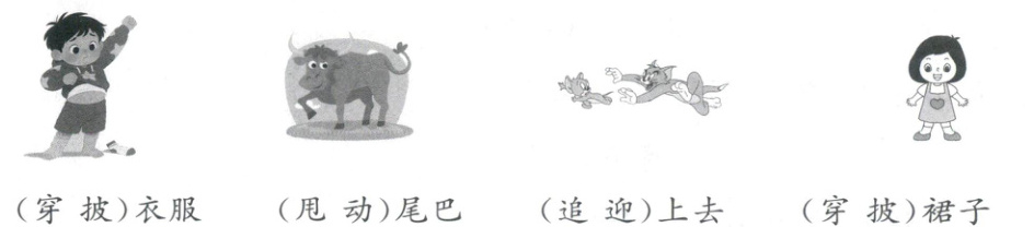 (穿 披)衣服 (甩 动)尾巴 (追 迎)上去 (穿 披)裙子
