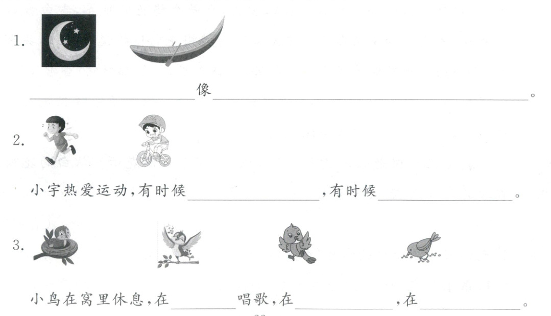 六、(新题型)句子加工厂。看图,补全句子。(9分)