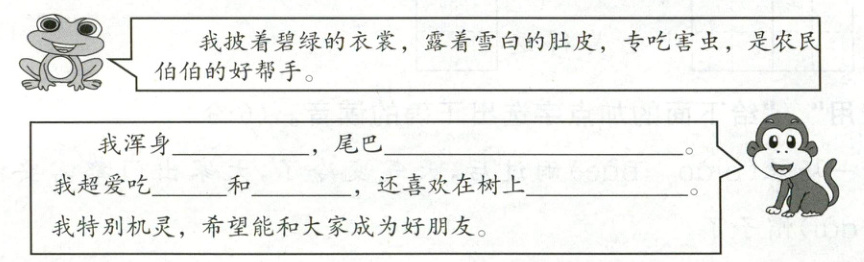 在“最有趣的小动物”评选环节中,青蛙第一个发言介绍自己。假如你是一只小猴子,请你仿照青蛙的发言,写一下自我介绍吧。