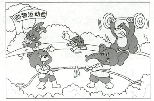 图中有哪些动物?他们各自在参加什么运动项目?仔细看图,编写一个有趣的故事吧。