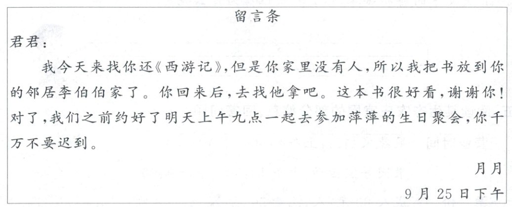 ②告诉君君去邻居李伯伯家拿回《西游记》。