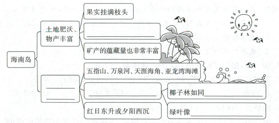 1.海南岛 富饶 美丽 2.海南岛是祖国的第二大岛,土地肥沃,物产丰富。 海南岛一年四季气候宜人,风景优美。 3.(从左往右、从上至下)气候宜人、风景优美 名贵水产不计其数 椰林风光 一道道绿色的屏障 一把撑开的大伞
