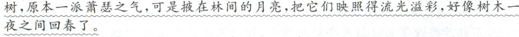 5.示例:月亮挂在树上,将原本昏暗不堪的树林照亮。在月光洒下的时候,那些掉光了叶子、还未发芽的树也不显得光秃秃的了,反而十分有生气,好像回春了一样。