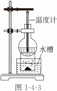 6. 如图 1 - 4 - 3 所示,将盛有少量冷水的烧瓶放在装有少量碘颗粒的烧杯口处,并将烧杯放在盛有热水的水槽中。不久会观察到烧杯内固态碘减少且出现紫色的碘蒸气,这是