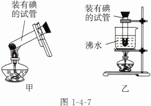 按照要求,小明设计的实验方案如图 1 - 4 - 7 甲所示,直接用酒精灯对装有固态碘的密闭试管加热;小丽设计的实验方案如图 1 - 4 - 7 乙所示,将装有固态碘的密闭试管放在沸水中加热。
