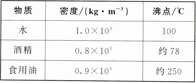| 物质 | 密度/(kg·m⁻^3) | 沸点/℃ |