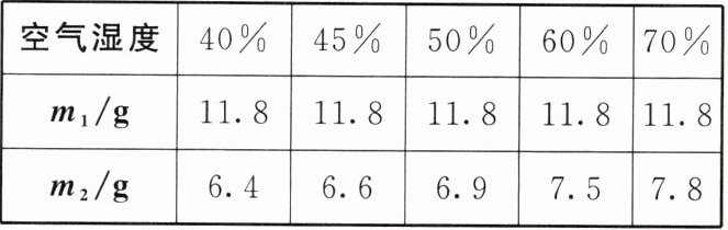g。由实验数据可得出结论:当水温、水的表面积和水面上方空气流动情况等条件均相同时,空气湿度越 小