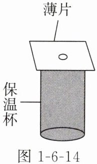 (2)小华做了如图 1 - 6 - 14 所示的改进,用热水改变酒精的温度。在保温杯内加满 $70^{\circ}C$ 的热水,用薄片盖在保温杯上且与水面充分接触,将 $0.1$ mL 酒精滴在薄片上,记录酒精完全蒸发所用的时间。保持其他条件相同,换用 $70^{\circ}C$ 以下不同温度的热水多次实验。为了让酒精温度快速达到相对应的水温,他可选择